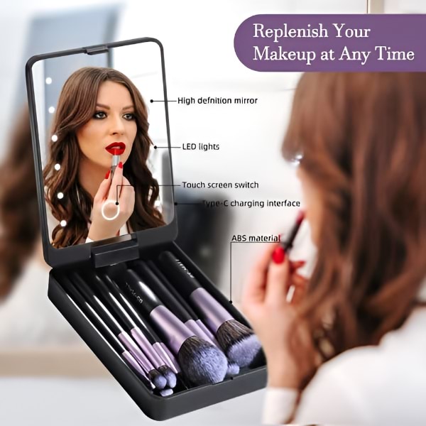 Con este conjunto de brochas de maquillaje de viaje y espejo LED, disfruta de la facilidad de una aplicación de maquillaje impecable dondequiera que estés, convirtiéndolo en tu compañero de viaje ideal.