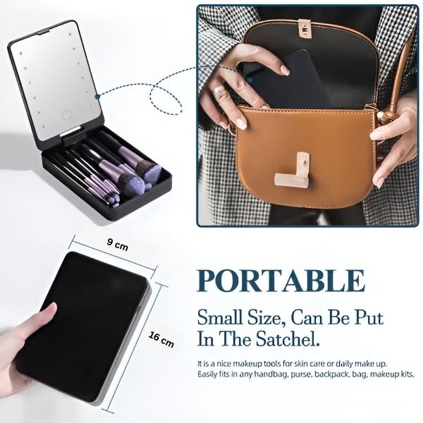 El conjunto de brochas y el espejo LED encajan perfectamente en tu bolso, así que puedes retocar tu maquillaje con facilidad dondequiera que te lleve el día.